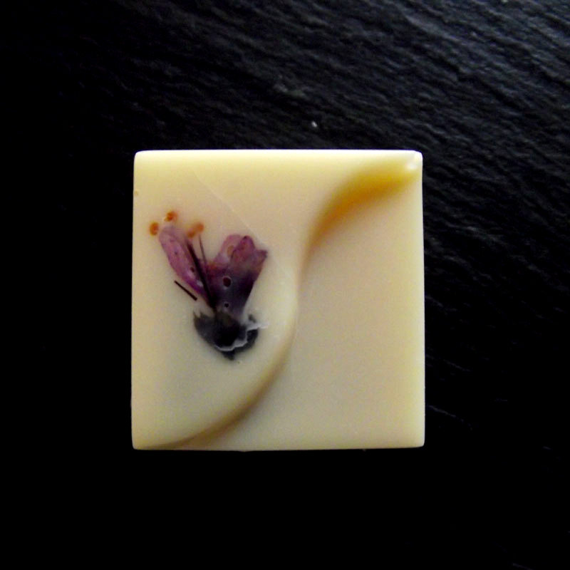 Für die Hohlkörper habe ich die Basilikumblüten zwischen Buchseiten und Küchenkrepp gepresst und getrocknet, jeweils eine Blüte in die Pralinenmulde gelegt und mit temperierter Kakaobutter fixiert. Danach habe ich die Hohlkörper - wie gewohnt - gegossen. Mit anderen Blüten und Blättern funktioniert das selbstverständlich auch.
